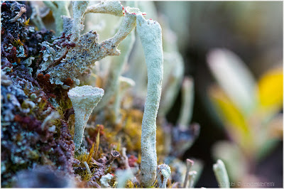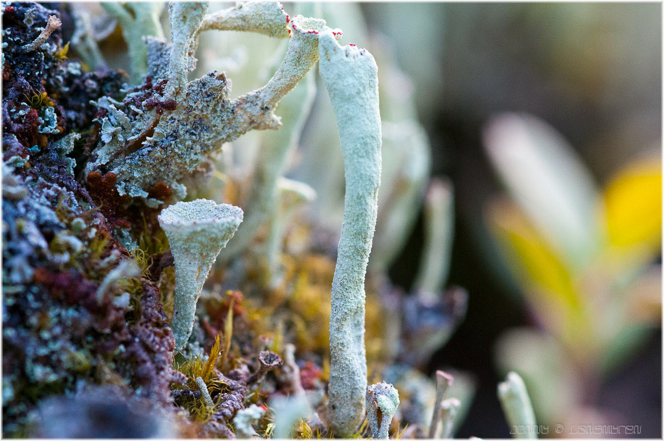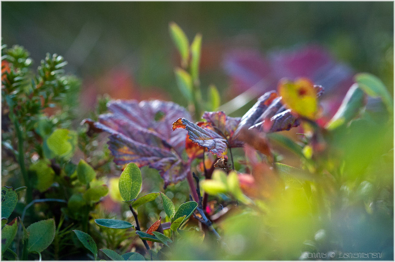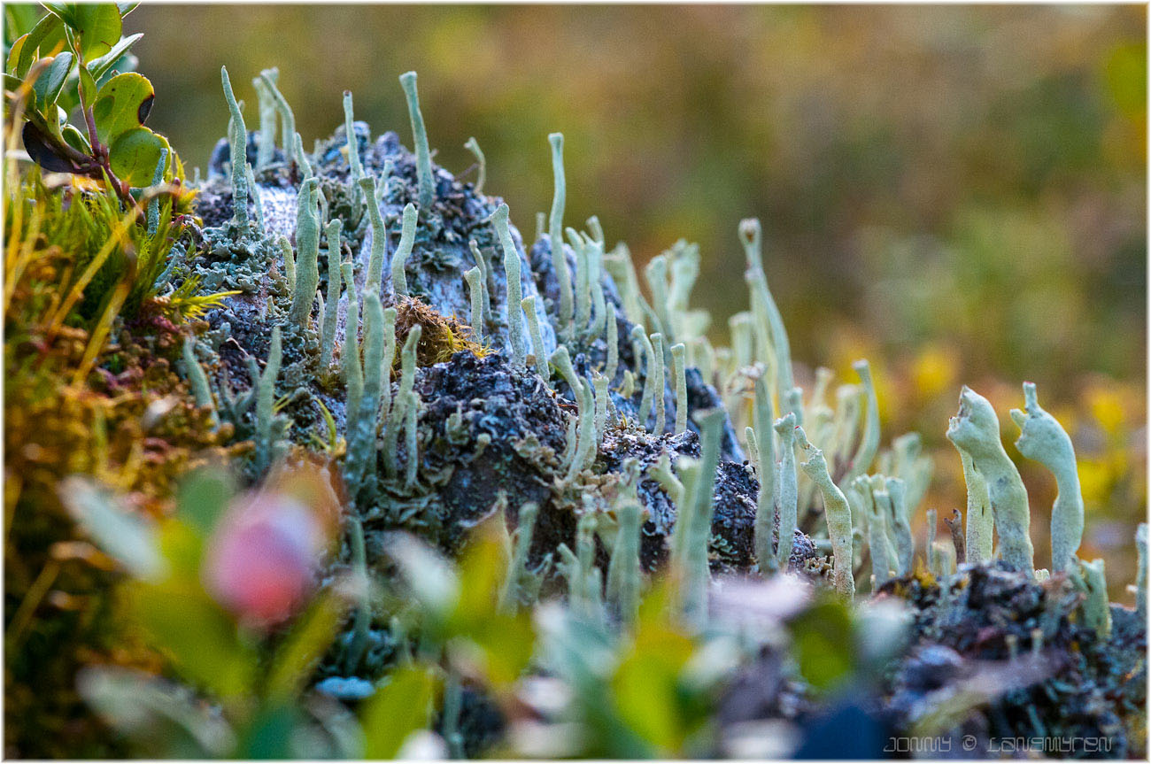 om å trede fotoapparatet ned i lyngen og en morken stubbe.